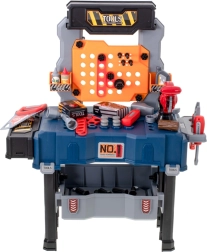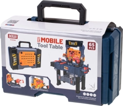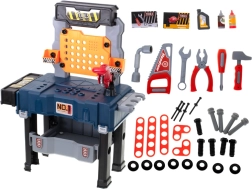 Deze draagbare koffer vouw je gemakkelijk uit tot een kinderwerkbank met veel opbergruimte – van een onderste bak voor grotere onderdelen, via een geperforeerde wand voor gereedschap, tot twee plankjes en een ruim werkblad. Kinderen leren de basis van klussen en kunnen veilig activiteiten uitproberen zoals “schroeven”, “timmeren” of “zagen”.