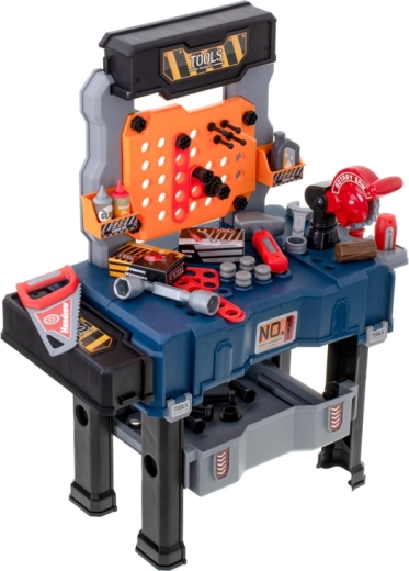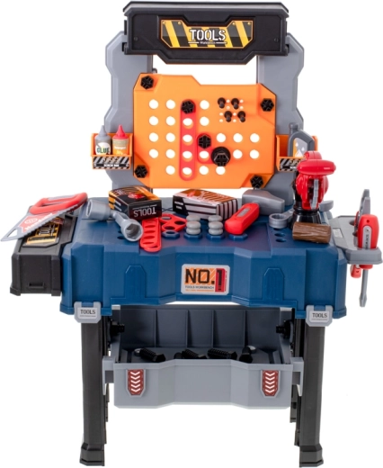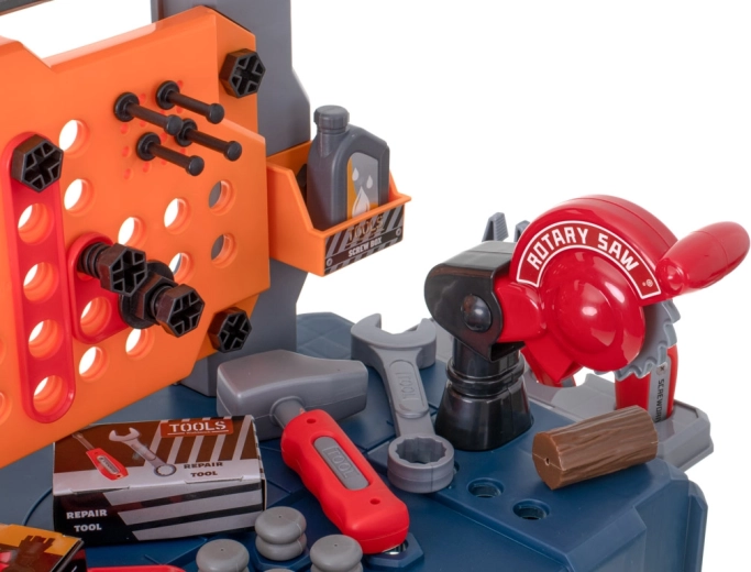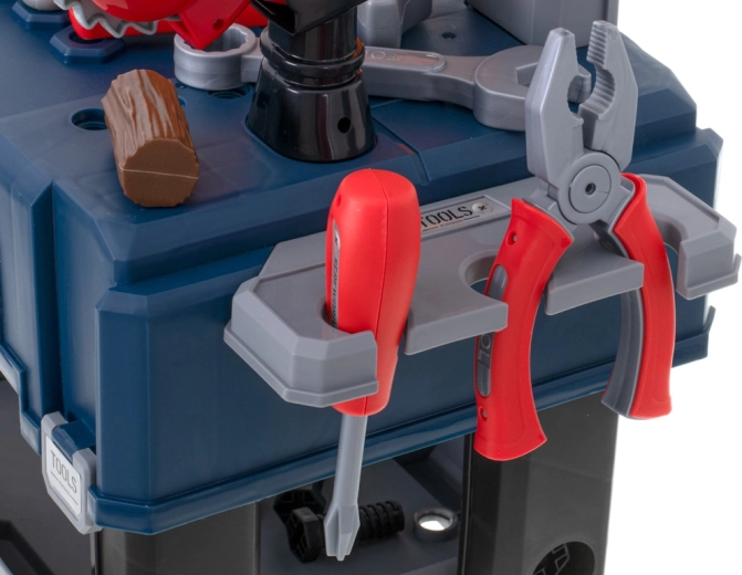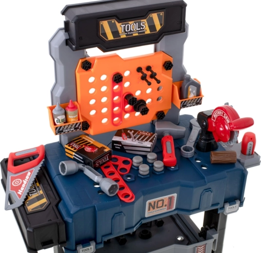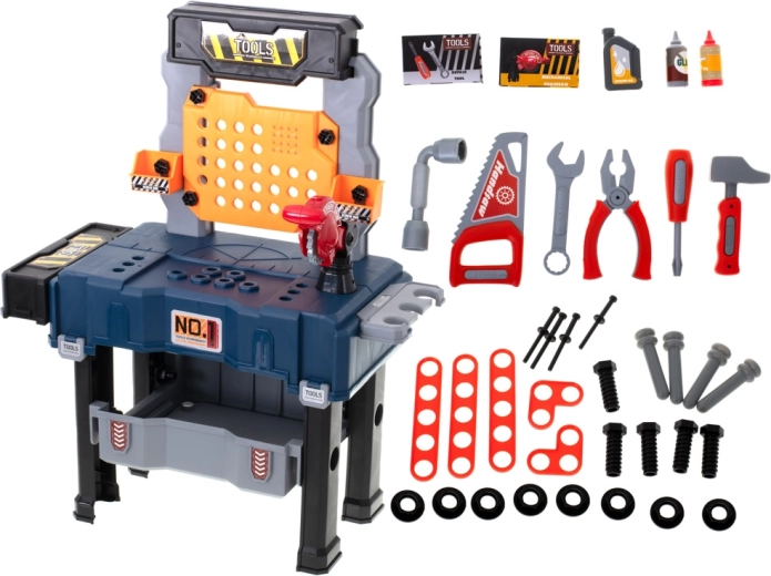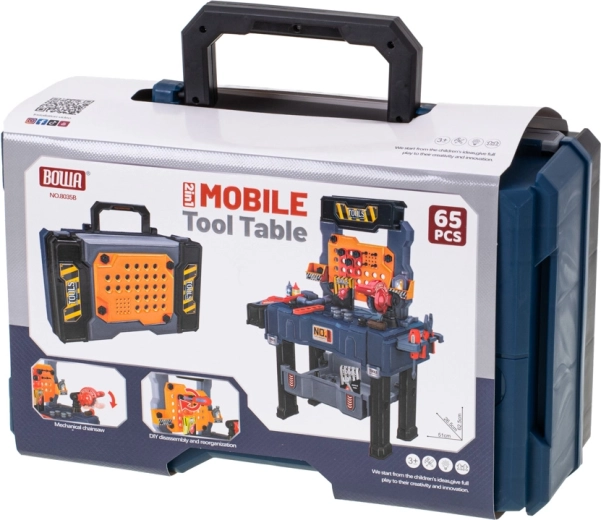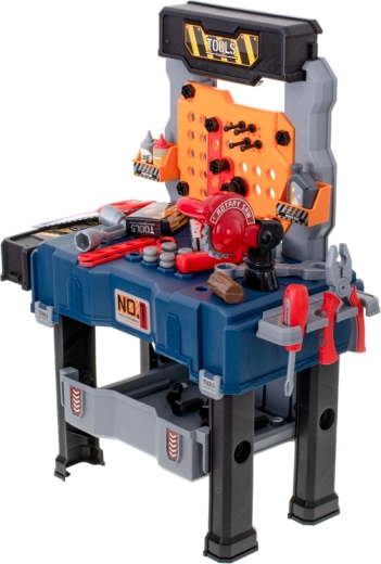Praktische kinderwerkbank in de vorm van een koffer die elke kamer in een kleine werkplaats verandert. 65-delige set van kunststof gereedschap en accessoires ondersteunt fijne motoriek, creativiteit en rollenspel. De koffer verandert eenvoudig in een stabiele werkbank met een geperforeerde wand, plankjes en een groot werkblad.