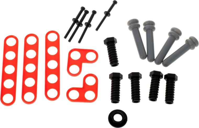 - Werkbank/koffer, 12 schroeven, 6 korte schroefjes, 6 moeren/opzetstukken, 4 spijkers, zaag, handzaag, 2 sleutels, schroevendraaier, hamertje, tang, verbindingsstukken, stickers
