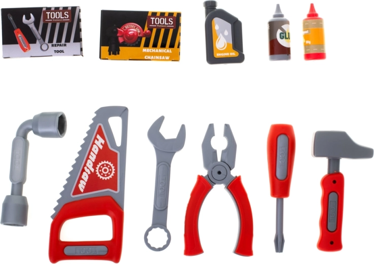 Bevat schroeven, moeren, spijkers, zaag, sleutels, schroevendraaier, hamertje, tang en verbindingsstukken – alles voor realistisch en creatief spel.