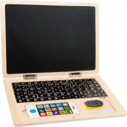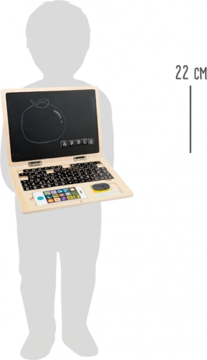 Deze houten notebook biedt een interactieve en educatieve ervaring voor kinderen. Het is uitgerust met verplaatsbare onderdelen zoals letters, cijfers en symbolen die eenvoudig kunnen worden verplaatst op het magnetische bord om woorden te vormen of wiskundige problemen op te lossen. Daarnaast is er een krijtdeel waar kinderen kunnen tekenen en schrijven, en alles eenvoudig kunnen wissen met een doekje.
