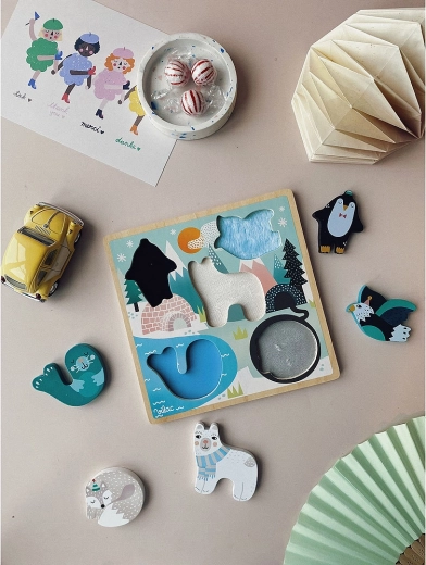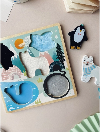 Deze houten, sensorische puzzel met pooldieren (pinguïn, ijsbeer, zeehond, walvis en vogeltje) brengt kinderen plezier in het ontdekken. Na het uitnemen van de massieve stukjes voelen kinderen de onderlagen met verschillende texturen, die het waarnemen van oppervlakken stimuleren en hen leren vormen en materialen te onderscheiden. De stevige houten uitvoering is duurzaam en makkelijk vast te pakken, ook voor de allerkleinsten.