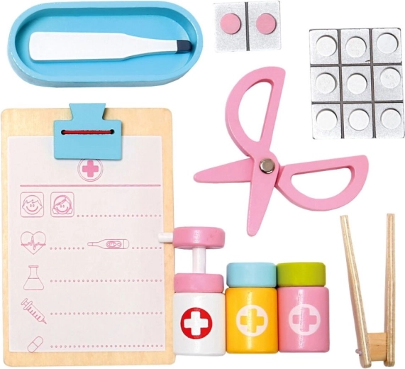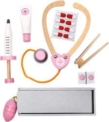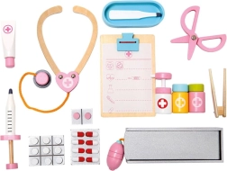 De set bevat houten hulpmiddelen zoals een stethoscoop, injectiespuit en andere benodigdheden die realistisch spel ondersteunen.