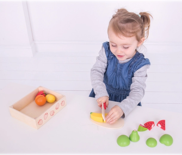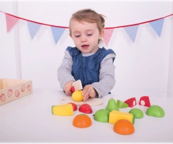 Bij het “snijden” van de houten vruchten met het veilige mes oefenen kinderen hun greep, oog-handcoördinatie en de precisie van hun bewegingen.