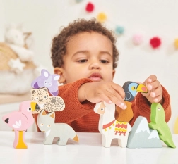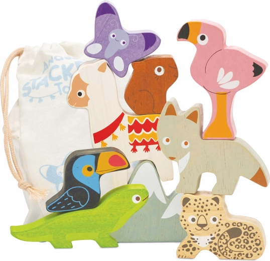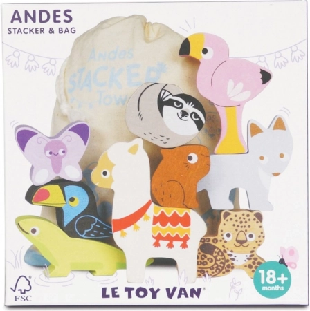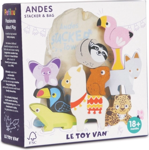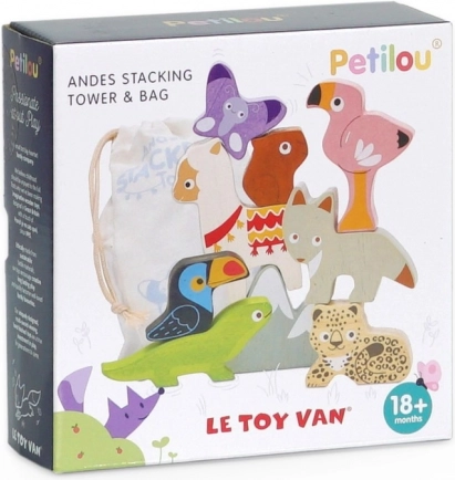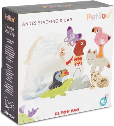 Deze Andes stapeltoren brengt het bergavontuur rechtstreeks naar de kinderkamer. De set bevat robuuste houten dierfiguren (bijv. lama, flamingo, toekan, hagedis, vlinder, luiaard) en een bergdeel die je kunt stapelen, balanceren en combineren tot speelse composities.