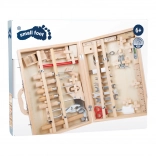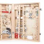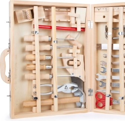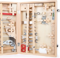 In de koffer vind je alles wat nodig is voor kleine huisprojecten en rollenspellen als vakman: sleutels, schroevendraaiers, een zaag, schaar, beitel, timmermanspotlood, inbussleutel, hamer en extra accessoires. De 48-delige set stimuleert fijne motoriek, concentratie en creativiteit.
