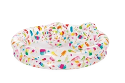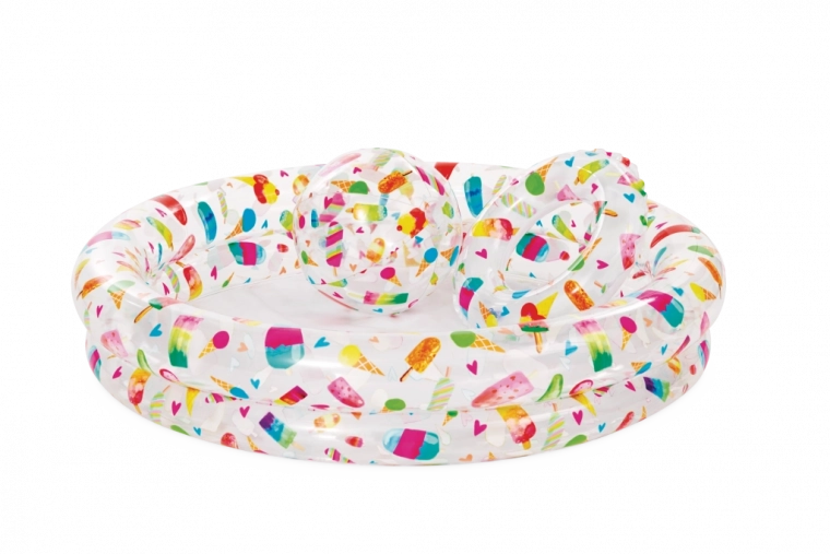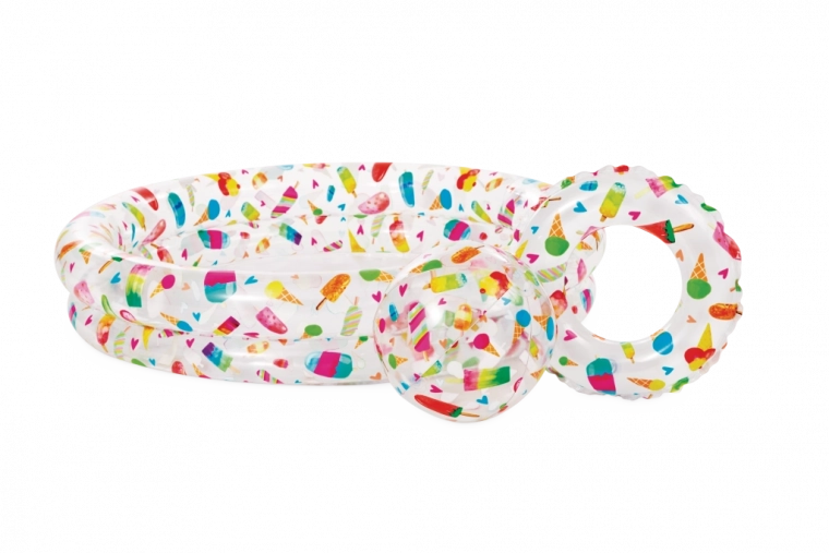 De set bevat een opblaasbaar zwembad, een zwemring en een strandbal – kinderen kunnen spetteren, de bal vangen en vertrouwen in het water opbouwen.