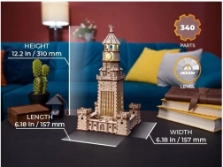 De set bevat 340 nauwkeurig uitgesneden houten onderdelen en een gedetailleerde handleiding. De montage is haalbaar voor handige beginners en biedt toch genoeg uitdaging voor gevorderden. De voeding kan optioneel via USB‑C of 3× AA (niet inbegrepen in de verpakking), zodat het model gemakkelijk in elke ruimte past.