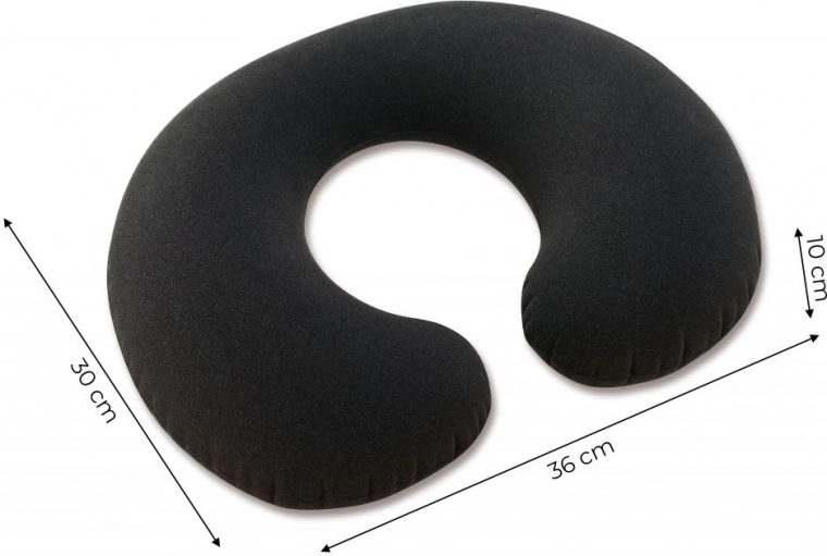 De constructie van duurzaam PVC in combinatie met zacht velours aan de buitenkant zorgt voor een prettig huidcontact en verhoogde slijtvastheid. Het kussen heeft in opgeblazen toestand de afmetingen 36 × 30 × 10 cm; na het leeglaten vouwt u het eenvoudig op in een handtas of handbagage.