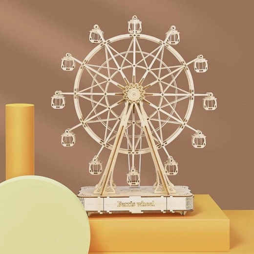 Gedetailleerde 3D-puzzel muziekdoos met het klassieke reuzenradmotief, perfect voor liefhebbers van modellen en muziek. Na het assembleren speelt hij de melodie uit de film De reis om de wereld in 80 dagen, verrast met een hoogwaardige 18-toons muziekdoos met Japanse componenten en biedt een gemiddelde moeilijkheidsgraad bij het bouwen uit 232 nauwkeurig uitgesneden onderdelen van hout en metaal.