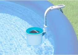 De INTEX 28000 skimmer reinigt betrouwbaar het oppervlak en houdt het water glashelder. Door chemische tabletten in het mandje te plaatsen zorgt hij voor veilige en gelijkmatige dosering. De verstelbare arm past zich eenvoudig aan de zwembadrand aan en de mand met inzetstuk vangt vuil effectief op.