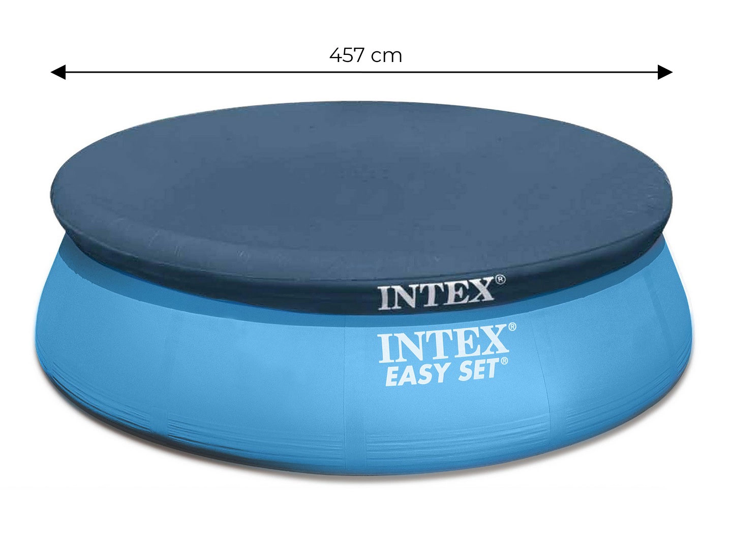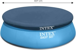Praktisch INTEX afdekzeil voor opzetbare ronde zwembaden met een diameter van 457 cm. Beschermt het water tegen bladeren, insecten en vuil. Dankzij de afvoergaten hoopt water zich niet op aan het oppervlak en helpt het zeil een stabielere watertemperatuur te behouden. Gemaakt van duurzaam materiaal, met een overlap van 30 cm voor veilige bevestiging en compatibel met zwembaden van verschillende merken met een randbreedte van 421 cm.