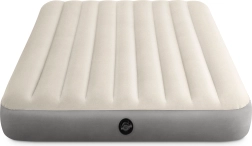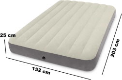 Tweepersoons opblaasbaar luchtbed INTEX met afmetingen 203 × 152 × 25 cm, ideaal voor thuis en kamperen. Het heeft een aangenaam velours oppervlak, een snelle Boston-ventiel voor eenvoudig op- en aflaten, en interne Dura-Beam Fiber-technologie voor betere lichaams ondersteuning. Inclusief reparatiepatch.
