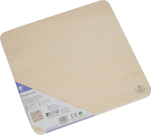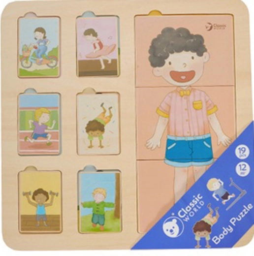 De houten puzzel van het menselijk lichaam van Classic World is het ideale speelgoed voor kinderen vanaf 12 maanden. Het bestaat uit een bord en 18 kleurrijke stukken die kinderen bij verschillende activiteiten voorstellen. Kinderen moeten de stukken op de juiste plaats leggen om een compleet plaatje te vormen.