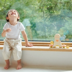 Het speelgoed is gemaakt van hoogwaardig natuurlijk hout met gladde randen en verf op waterbasis. De pastelaccenten zijn aantrekkelijk voor kinderen en tegelijk tijdloos.