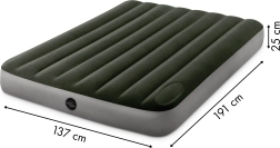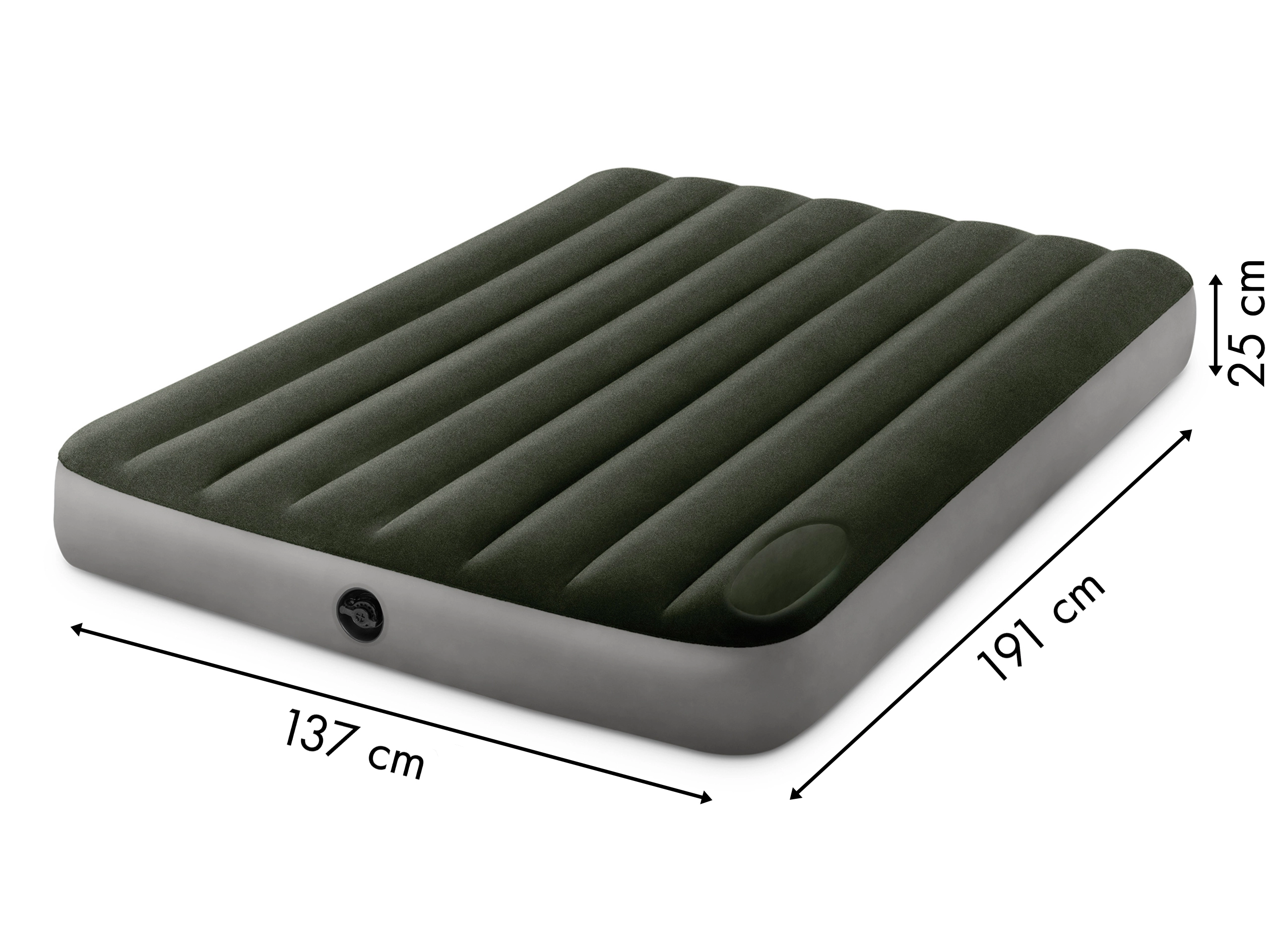 Opblaasbaar bed met afmeting 1,37 m x 1,91 m x 25 cm. Maximale draagcapaciteit 272 kg. Opblaastijd is 3,5 minuut.