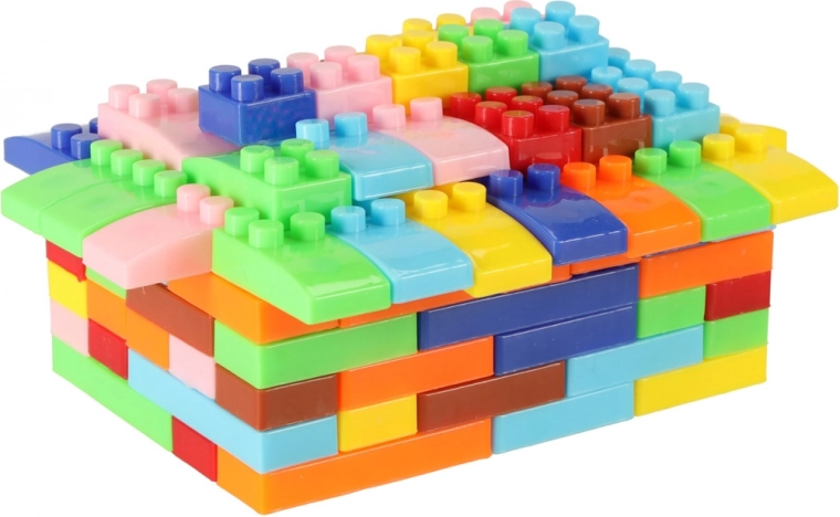 Een grote mix van meerkleurige blokken inspireert tot het maken van huisjes, figuurtjes, getallen en originele modellen.