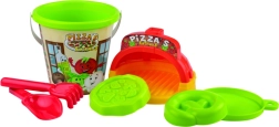Emmer, zeef in de vorm van een pizzaoven, schep, hark, vormpje in de vorm van een bakvorm, pizzavormpje, vlechtvormpje