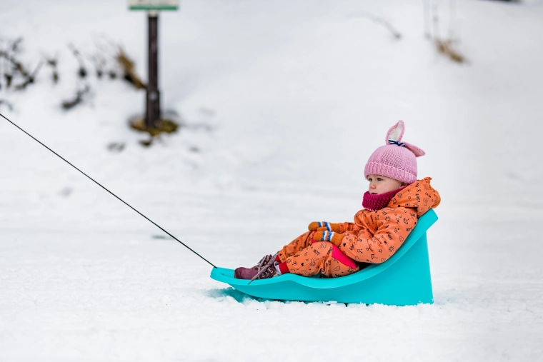 De slee is voorzien van een veiligheidsriem die ervoor zorgt dat het kind tijdens de rit op zijn plaats blijft.
