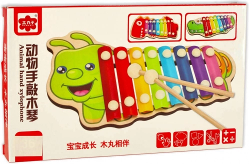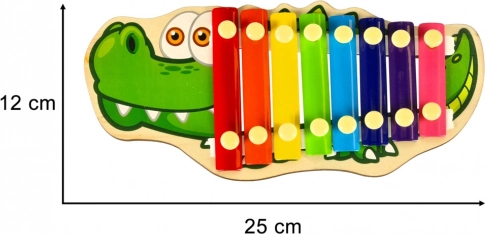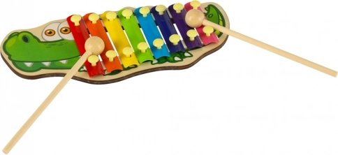 Houten xylofoon voor kinderen in de vorm van een krokodil. 8 kleurrijke tonen, 2 stokjes, kaartje met melodieën. Ontwikkelt ritme, motoriek en creativiteit. Vanaf 3 jaar.