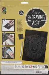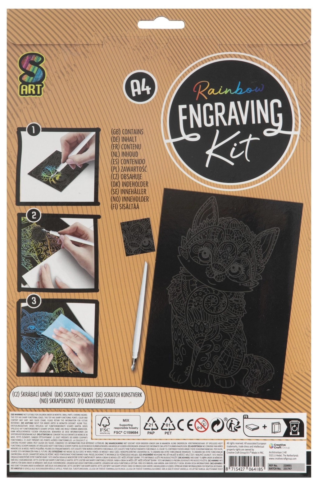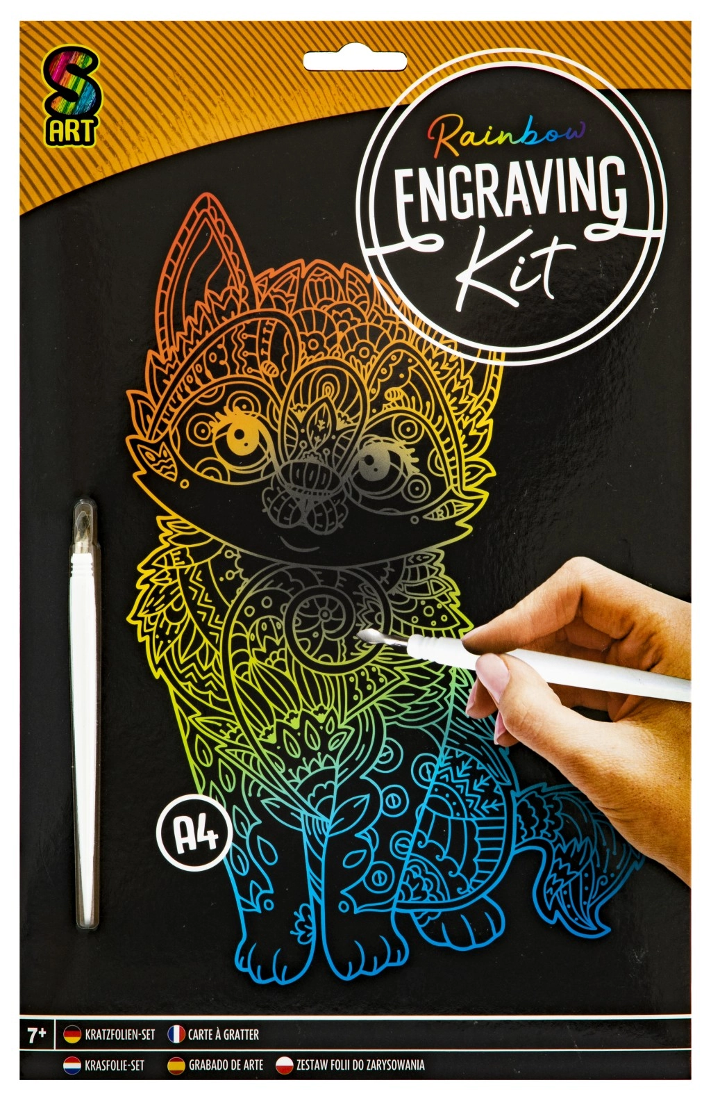 Maak je eigen originele kunstwerk met een kattenmotief – kras zachtjes de voorbedrukte lijnen weg en onder de zwarte deklaag verschijnen regenboogkleuren. Laat je fantasie de vrije loop: je kunt ook de vrije zwarte vlakken inkleuren en je eigen kader of details creëren.