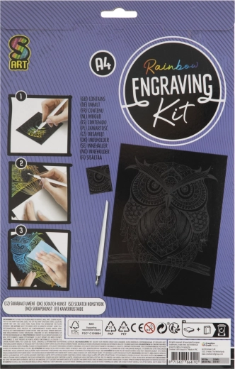 - Inhoud van de verpakking: afbeelding met regenbooglaag (25 × 20 cm), kunststof kraspen met metalen punt (ca. 14,5 cm), oefenafbeelding (7 × 6 cm)