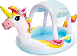 Schattig opblaasbaar zwembad in de vorm van een eenhoorn geeft kinderen uren zomers plezier. Dankzij de geïntegreerde watersproeier en het kleurrijke afdak biedt het verfrissing en gedeeltelijke schaduw. Gemaakt van kwaliteitsvinyl, heeft een capaciteit tot 130 l, afmetingen 2,54 × 1,32 × 1,09 m en is geschikt voor kinderen vanaf 2 jaar. Inclusief reparatiepatch.
