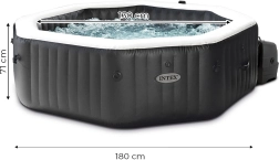 De INTEX opblaasbare spa in elegante zwarte kleur verandert je terras, tuin of interieur in een privéspa. De binnendiameter van 150 cm biedt comfortabel plaats aan maximaal 4 personen, terwijl 120 bubbels spierspanning verminderen en elke avond veraangenamen. Dankzij de snelle verwarming tot 40 °C geniet je zonder onnodig wachten van een warm bad.