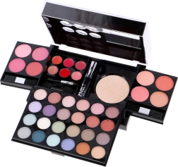 De palette combineert oogschaduw, blush, gloss, poeder en mascara in een elegant zwart doosje met spiegel – ideaal voor op reis en voor elke dag.