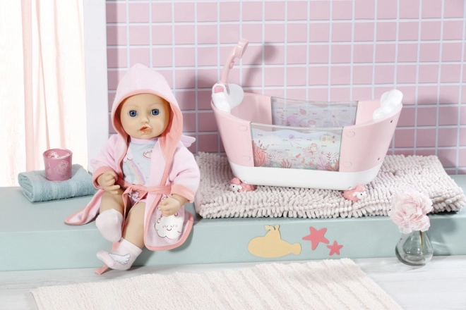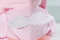 Laat je Baby Annabell betoverende momentjes beleven met deze stijlvolle badjas en pyjama. De badjas is versierd met vleugeltjes, waardoor het niet alleen modieus is maar ook een comfortabele accessoire voor het spel. Onder de badjas draagt de pop een korte onesie met een print van een schaapje dat geniet van een regenboogdouche. Om de voetjes lekker warm te houden, bevat de set ook roze sokken met vleugeltjesmotief.