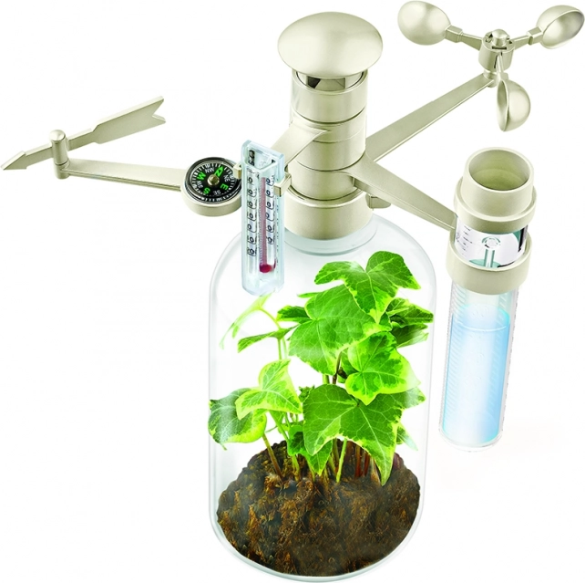 Een leuk en educatief meteorologisch station voor kinderen vanaf 5 jaar. Dit station stelt kinderen in staat om weergegevens te volgen en te registreren met behulp van een mini-observatorium en om het broeikaseffect te begrijpen via een flesterraium.