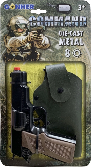 Politiepistool Command is ontworpen met een gedetailleerd metalen frame en een plastic handvat, dat doet denken aan een echt wapen.