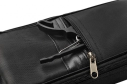 Twee voorvakken: het bovenste voor kleinigheden (plectrums, capo, snaren) en het onderste voor bladmuziek of schriften in A4-formaat.