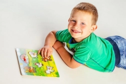 Elk puzzelstukje is voorzien van een klein houten handvat, waardoor kinderen eenvoudig het grijpen en plaatsen van stukjes op de juiste plek kunnen oefenen.