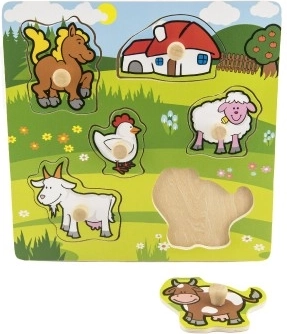 Deze puzzel bevat in totaal 5 kleurrijke dieren, waaronder een pony, geit, schaap, kip en koe, die dankzij kleine houten handvatten gemakkelijk vast te pakken zijn. Elk van de stukjes heeft een eigen plek op de houten basis, wat kinderen helpt om elk stukje op de juiste manier te plaatsen.
