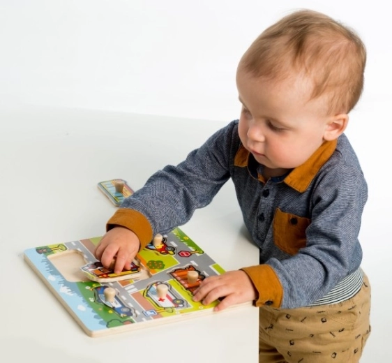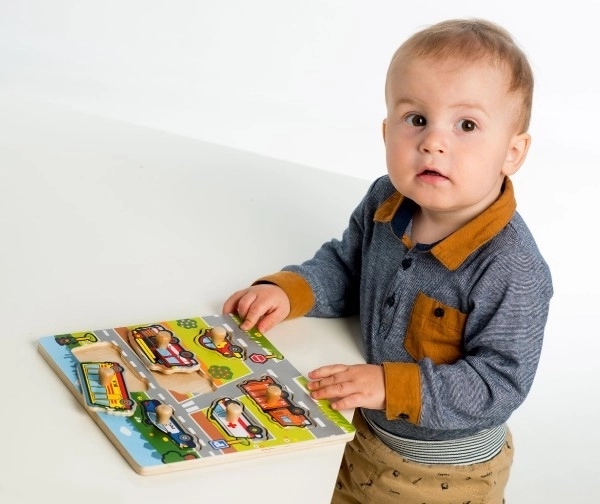 Elk van de zes insteekplaatjes laat een ander vervoersmiddel zien, namelijk een politieauto, bus, ambulance, brandweerwagen, vuilniswagen en personenauto. Het puzzelen is eenvoudig dankzij de houten basis en handgrepen, die het kleine handjes gemakkelijk maken om met de stukjes te manipuleren.