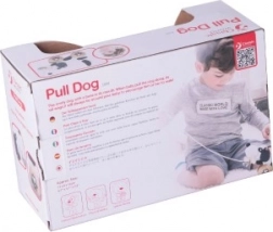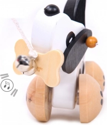 De hond heeft wieltjes met pootafdrukken en zijn staart wiebelt tijdens het bewegen, wat bijdraagt aan zijn speelsheid. Het plezier wordt vergroot door het belletje, dat het gehoor van kinderen stimuleert. Het is uitgerust met een touwtje dat aan een bot in zijn bek is bevestigd, wat gemakkelijk trekken mogelijk maakt. Het speelgoed is geschikt voor zowel binnen als buiten spelen.