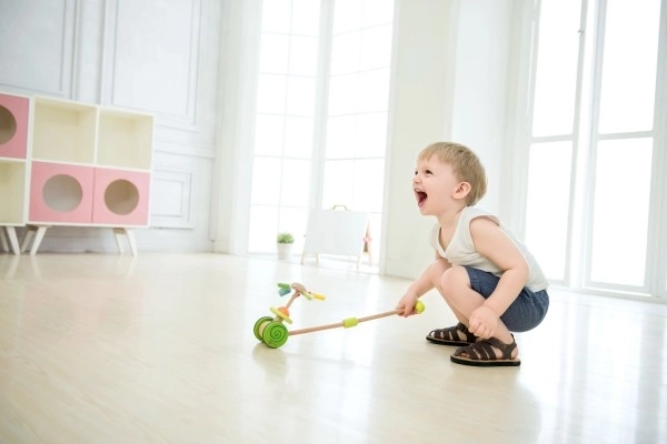Deze duwwagen helpt kinderen hun looptechniek te verbeteren en ondersteunt hun evenwicht.