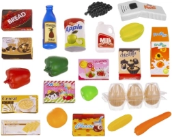 De set bevat kleurrijke groenten en fruit, drankjes, snoep, eieren en voedseldoosjes. Realistische accessoires ondersteunen spelenderwijs leren, het herkennen en sorteren van levensmiddelen. De stabiele kunststof uitvoering is duurzaam en veilig voor dagelijks spelen.