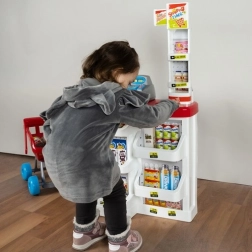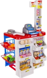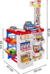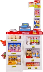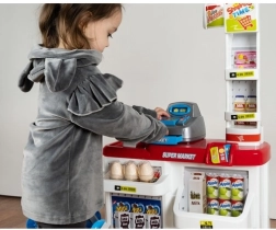 De kinder-supermarkt is ideaal voor kleine verkopers en klanten. Bevat een werkende kassa met uittrekbare lade, barcodescanner met geluid, winkelweegschaal, schappen met producten en een winkelwagentje. Dankzij de uitgebreide uitrusting oefenen kinderen rekenen, communicatie en zelfstandigheid.