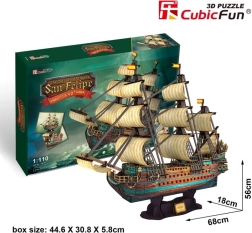 De 3D-puzzel van het zeilschip San Felipe van CubicFun biedt een realistisch model van een historische galei met rijke versiering en doordachte details op het dek. Onderdelen van ca. 3 mm foam, bekleed met gelamineerd bedrukt papier, klikken precies in elkaar en zorgen voor een stabiel en aantrekkelijk resultaat zonder lijm of schaar.