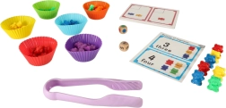 Deze kleurrijke set verbindt leren en spel. Kinderen kunnen rekenen, vergelijken en kleuren toewijzen, eenvoudige sommen oplossen en concentratie oefenen. Siliconen bekertjes helpen bij het sorteren, houten dobbelstenen en werkkaarten bieden tientallen activiteiten voor zelfstandig en samen spelen.