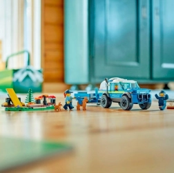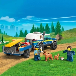 Deze actierijke set biedt alles voor realistische hondentraining: een stevige K9-politie-SUV met aanhanger, drie trainingselementen (wip, hekje en stapjes), een natuurscène en veel accessoires. Kinderen bouwen eenvoudig en spelen meteen als hondengeleiders die de hond en de puppy over de obstakels leiden.