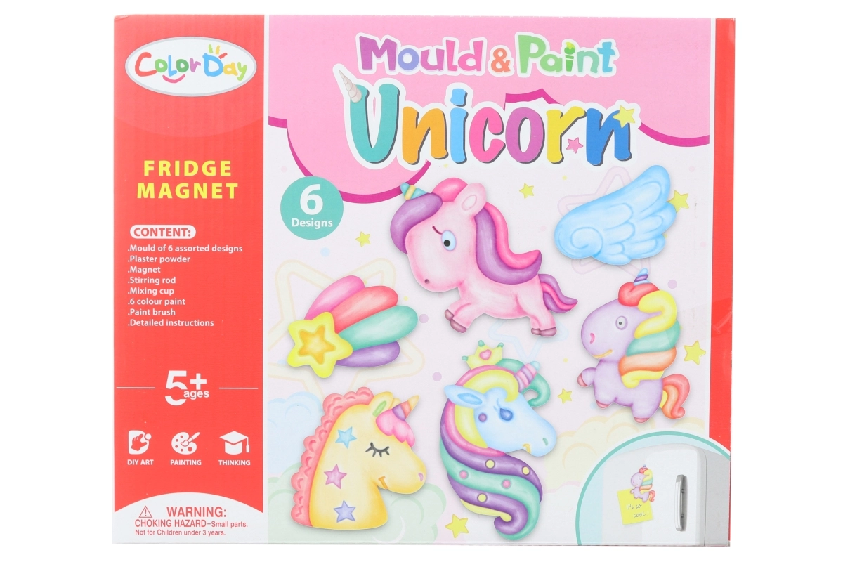 De set bevat gips, een plastic bakje, een plastic mal met 6 verschillende ontwerpen, 6 verfkleuren om in te kleuren, een penseel, magneten – je kunt een magneetje maken – en een handleiding. Afmetingen van de verpakking: 23 x 27 x 5,5 cm. Leeftijd 5+