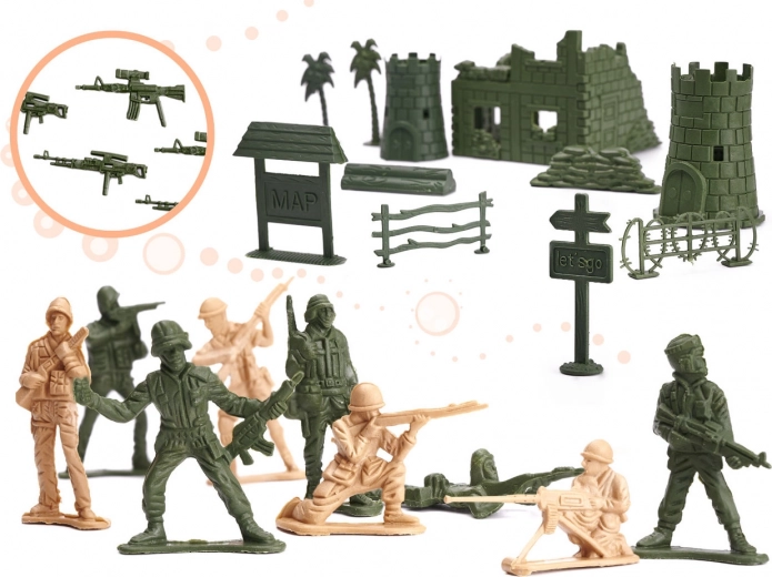 Complete set met ca. 60 soldaatjes en veel accessoires om een realistisch slagveld te bouwen en onbeperkt te spelen.