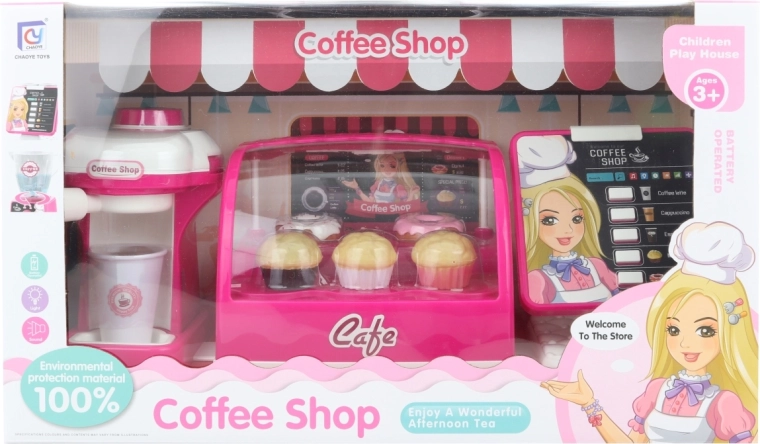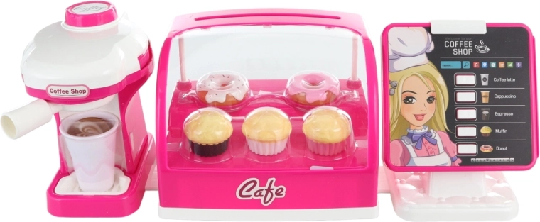 Ontdek de vreugde van spel met ons kindercafé op batterijen, ideaal voor kleine barista's. Deze speelset bevat alles wat je nodig hebt: een koffiemachine, een koelkast met taartjes en een kassa.