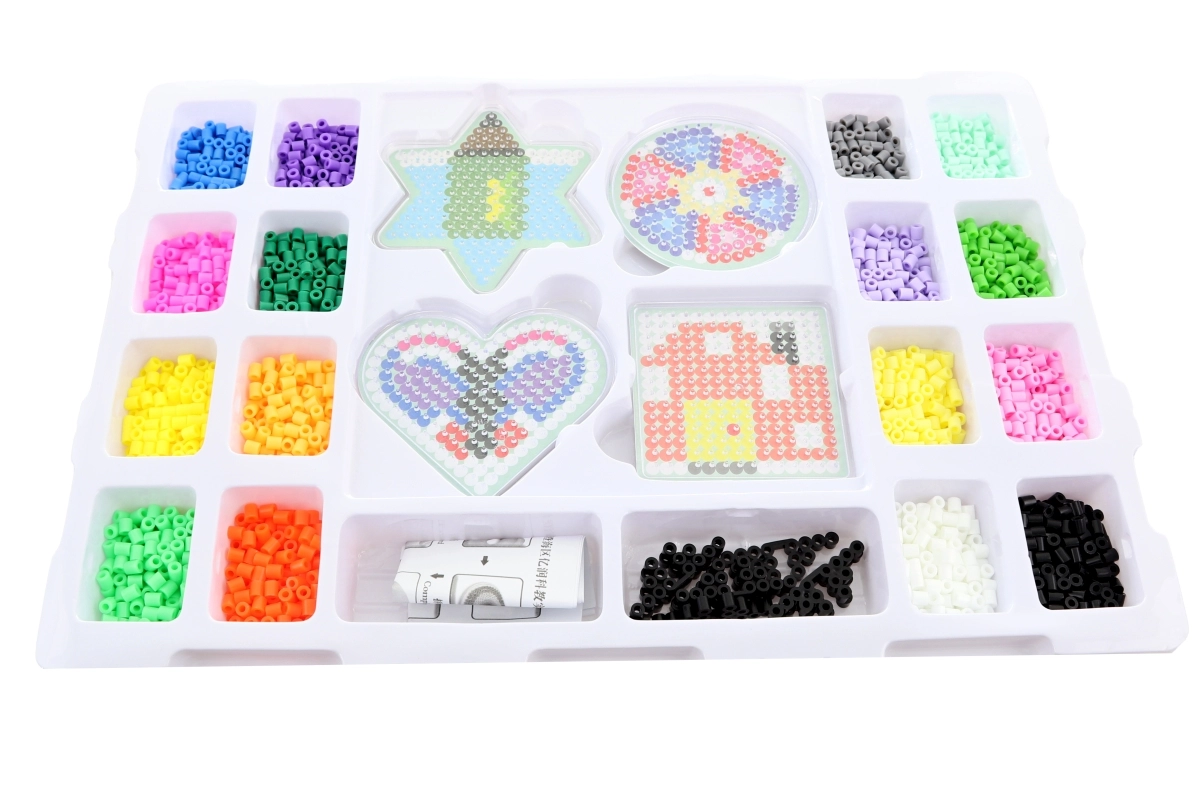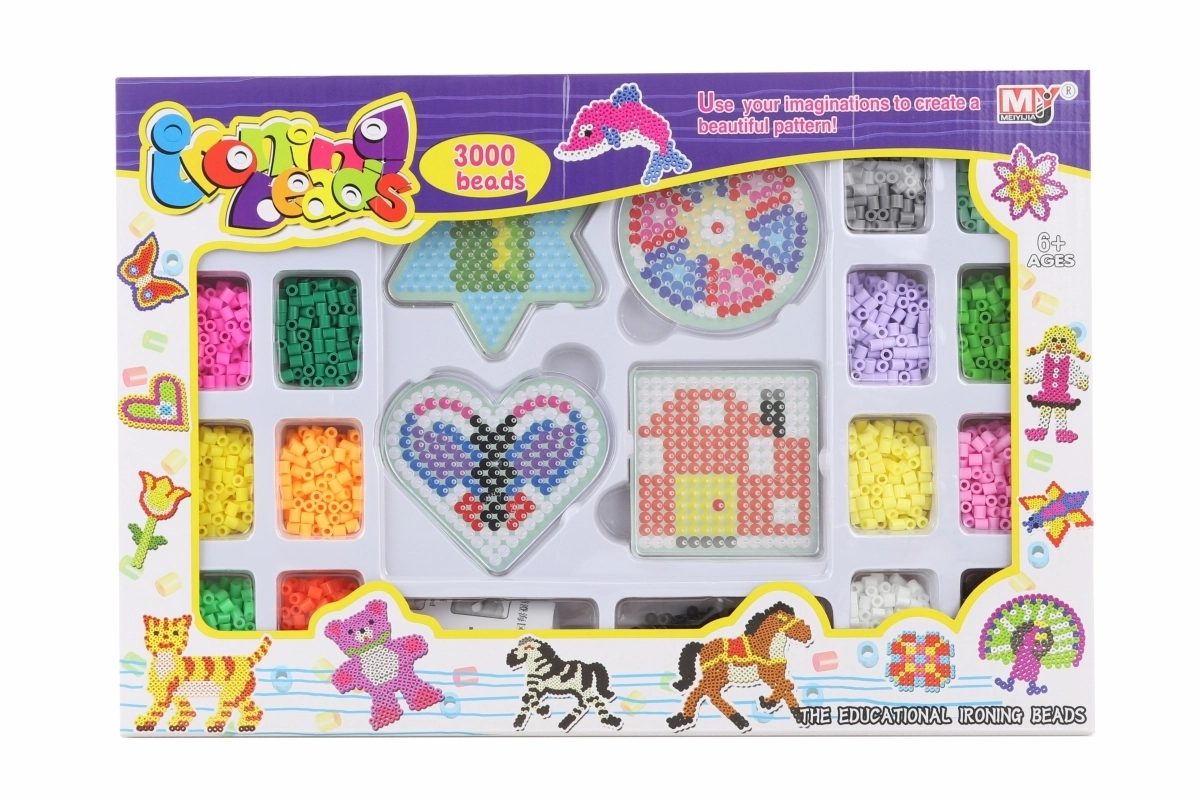 Grote set strijkkralen met circa 3000 kralen in verschillende kleuren. Afmetingen van de verpakking: ca. 39,5 x 27 x 3,5 cm. Leeftijd 6+.