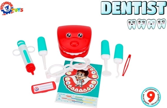 Deze kleurrijke tandartsset is ideaal voor kleine, nieuwsgierige dokters. Je vindt erin alles wat nodig is voor een leuk onderzoek van speelgoed: een kaakmodel, spiegeltje, sonde, boor, spuit, pincet, bril en badge. Ook inbegrepen is een overzichtelijk schema van tandenummering, waardoor kinderen gemakkelijk de basis van tandverzorging leren.