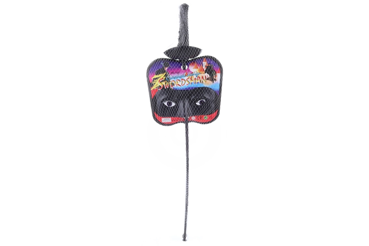 Kunststof degen van ca. 60 cm lang met kunststof masker met elastiek van ca. 17 cm breed. Verpakt in een netje. Afmetingen van de verpakking ca. 60 x 18,5 x 7,5 cm. Leeftijd 3+