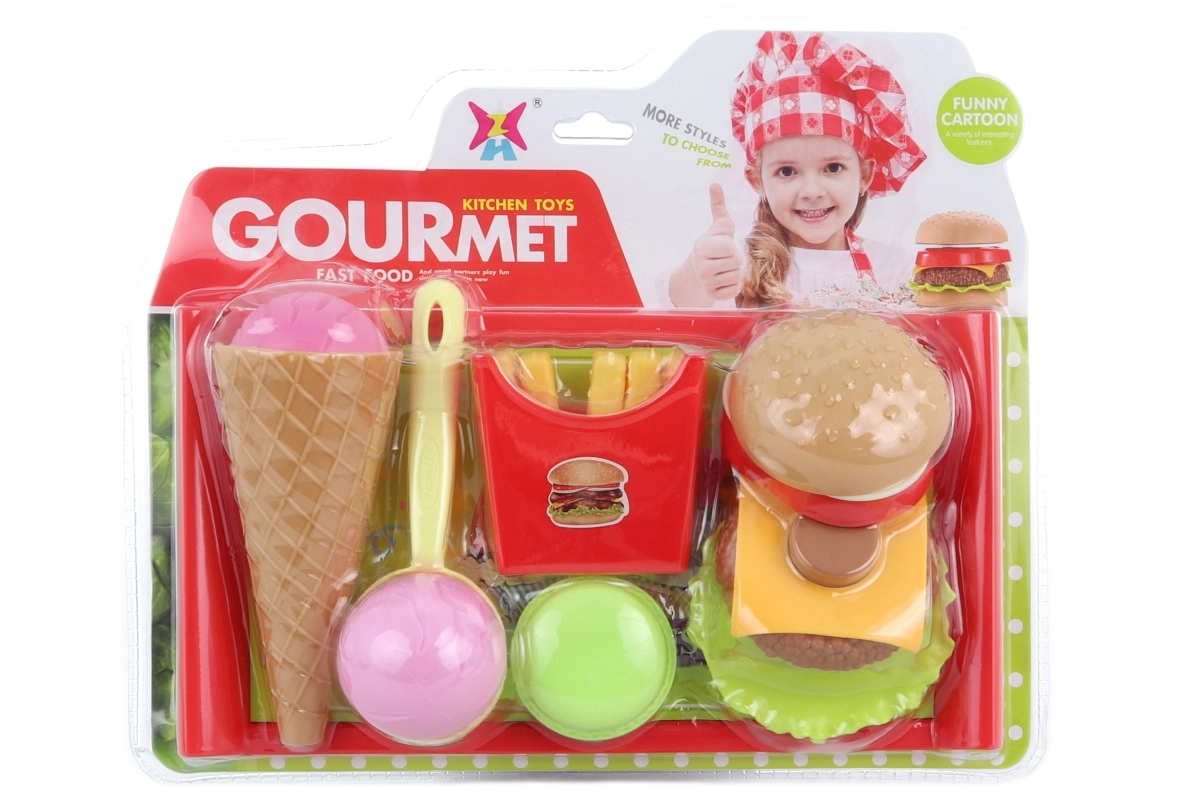 Leuke kinderset van plastic etenswaren met dienblad voor spel in de keuken of het restaurant. Bevat ijs in een hoorntje, een bolletje ijs met ijslepel, macaron, friet en een hamburger die uit losse ingrediënten kan worden gehaald. Ideaal voor het stimuleren van de fantasie, fijne motoriek en samen spelen.